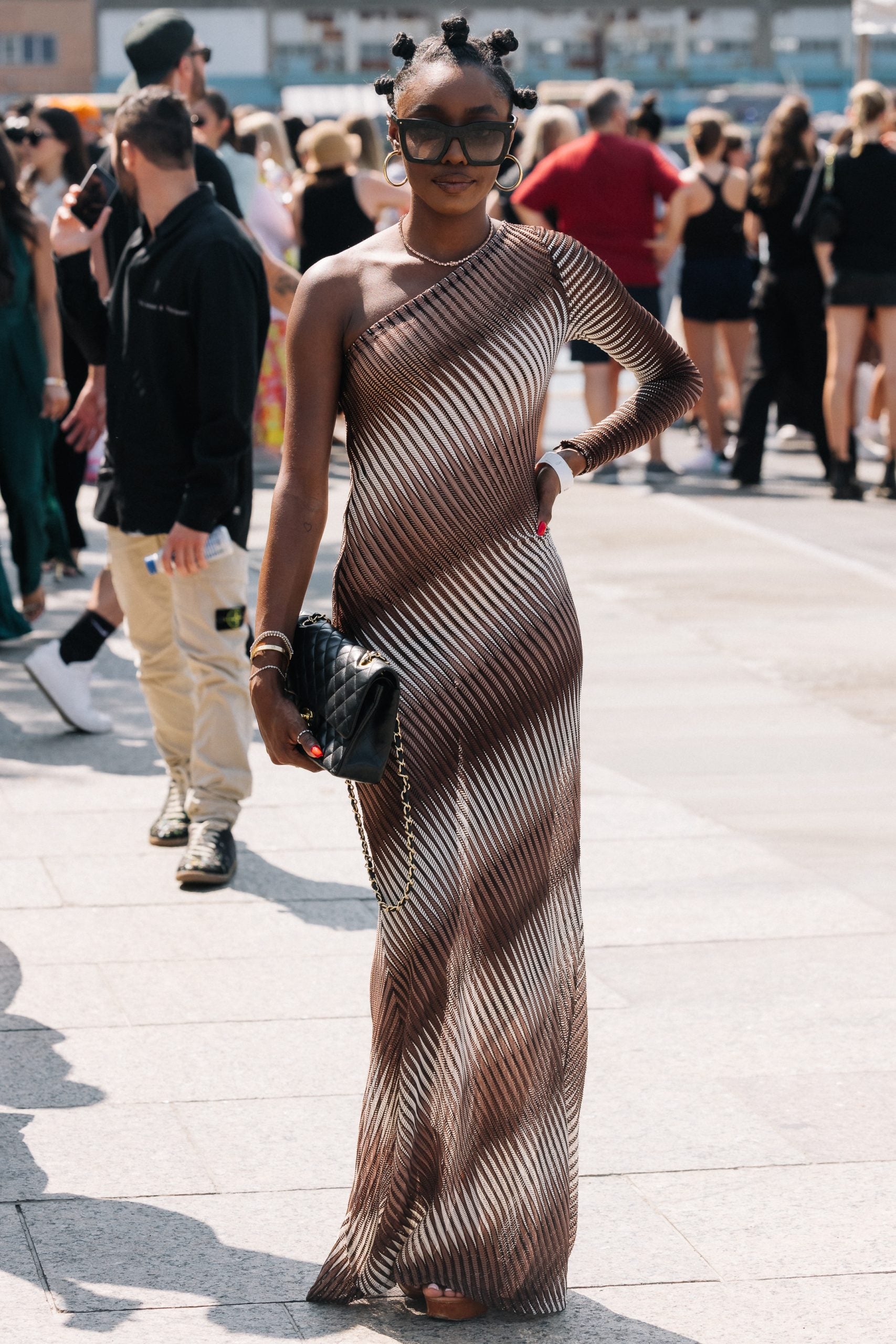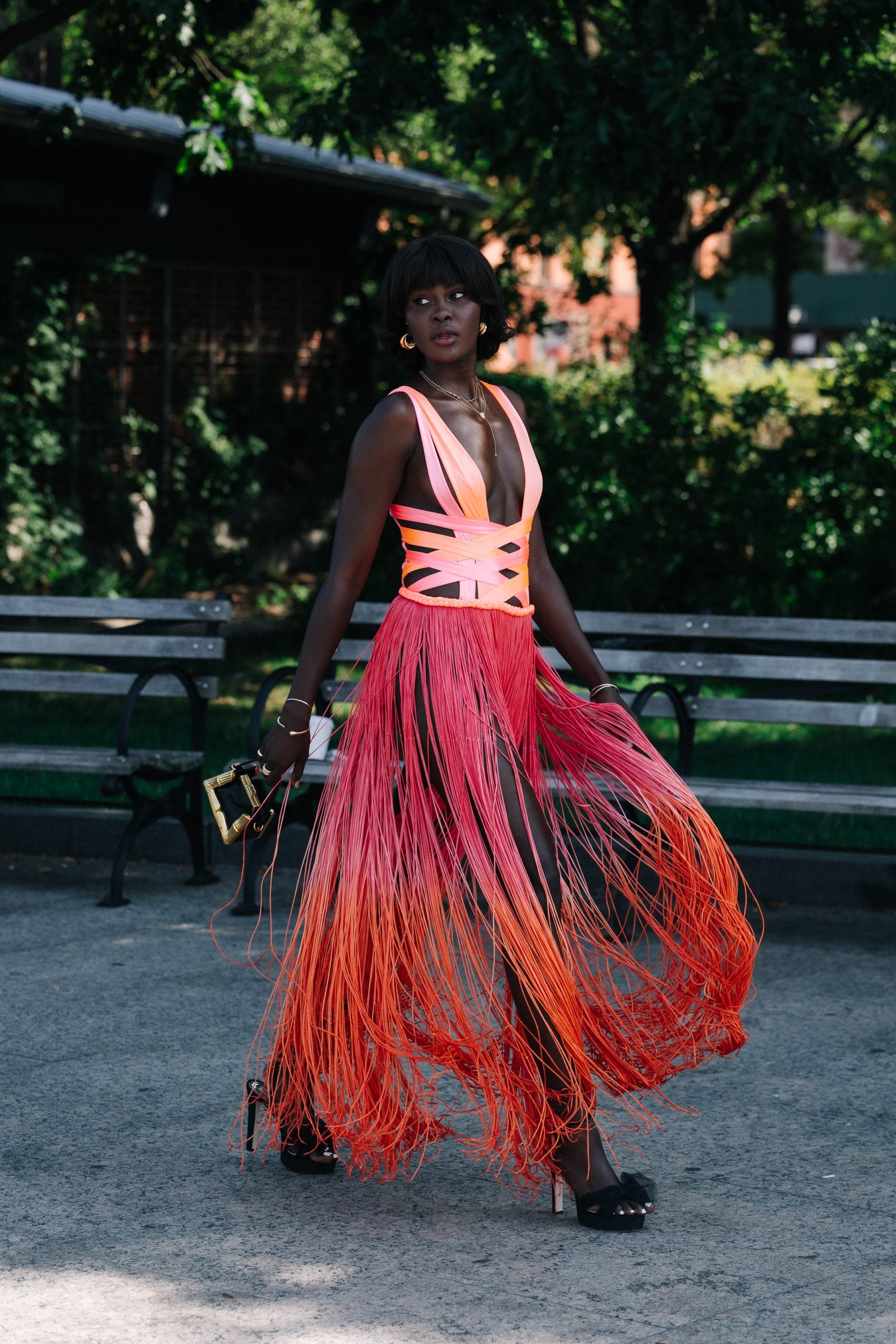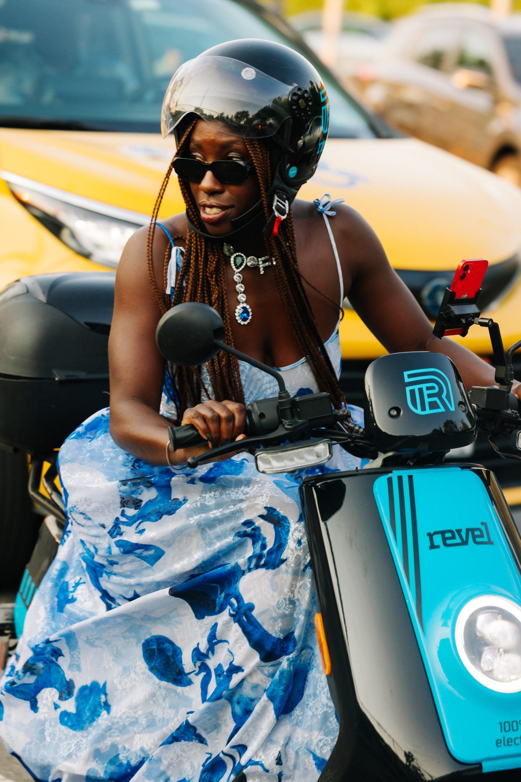 This season ESSENCE teamed up with renowned street style photographer Darrel Hunter (Mode Hunter) to capture the energy of street style—but make it Black AF. For day one, there are lots of monochrome looks and sets, a huge focus on prints, oversized blazers, rouged and pleated fabrics, and riding a moped in a gown, dripping in jewels.