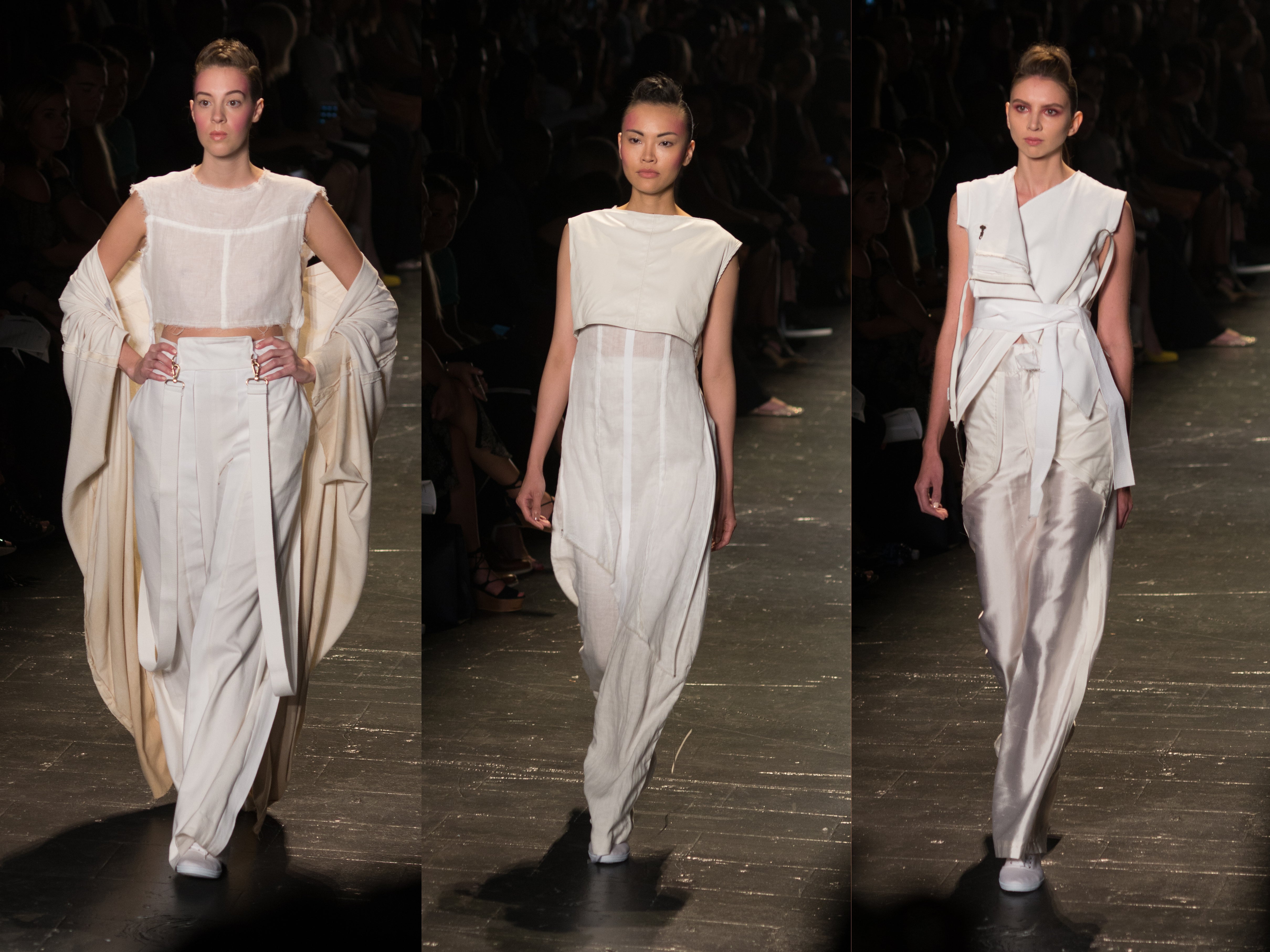 Arrington (a Houston, Texas girl), showed us what ‘deconstruction’ is all about. Having started her passion for design 10-years ago (right after high-school), she didn’t take her dream seriously until last year. Attending the Art Institutes in San Francisco, she says that her collection “…is a journey of the unraveled mind. A relationship of the mental institute and the nurse; it’s like, who’s really crazy, the nurse or the patient?” She used natural fibers like cotton, silk and linen for a minimalist approach with distressed details. The all-white color palette plays up to her theme and allows consumers to really ‘get-in’ to the pieces!