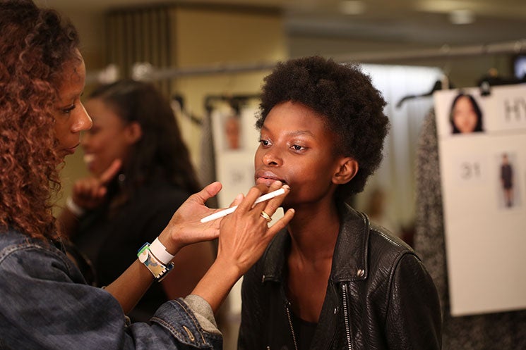 My first stop for NYFW was Creatures Of The Wind’s backstage area, where lead artist Mark Carrasquillo adorned every model (some of which were black- yas!) in strictly NARS Cosmetics. It was so refreshing to see a makeup look that didn’t require a crazy amount of products, and most of the products were skincare-based. They included: Multi Action Hydrating Toner, $32, Luminous Moisture Cream, $64, Eye Cream, $58, Radiant Creamy Concealer, $29, Stick Concealer, $25, All Day Luminous Powder Foundation, $48, Dragon Girl Velvet Matte Lip Pencil, $26, Exhibit A Blush, $30.