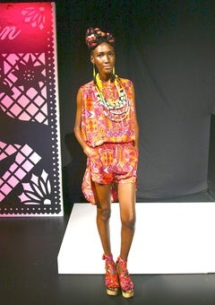 Mexican influences were overwhelmingly evident in Mara Hoffman’s Spring 2012 collection, with multicolored Aztec prints playing on jumpsuits, lithe jersey dresses, and maxi frocks. Patterns mixing red, orange, blue, purple, celery, and navy were the background for layered, beaded jewelry and dramatically bold earrings. Whispy asymmetrical tops were paired with hot pink shorts; delightfully sheer dresses stood atop high-wedged heels. While the clothes were undoubtedly drool worthy, the most outstanding part of the collection might have to have been the model’s braided updos, which were crimped, piled high, and weaved with ribbons. Tell us, ladies, would you try that look?