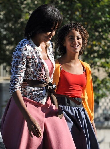 A recent visit to church was undoubtedly a fashionable affair. A suede plum perforated Alaia dress with a matching jacket and thigh-high kitten boots was Michelle Obama’s ensemble of choice, while Sasha sported a collarless coat in a matching shade with a sweet gold belted print dress.