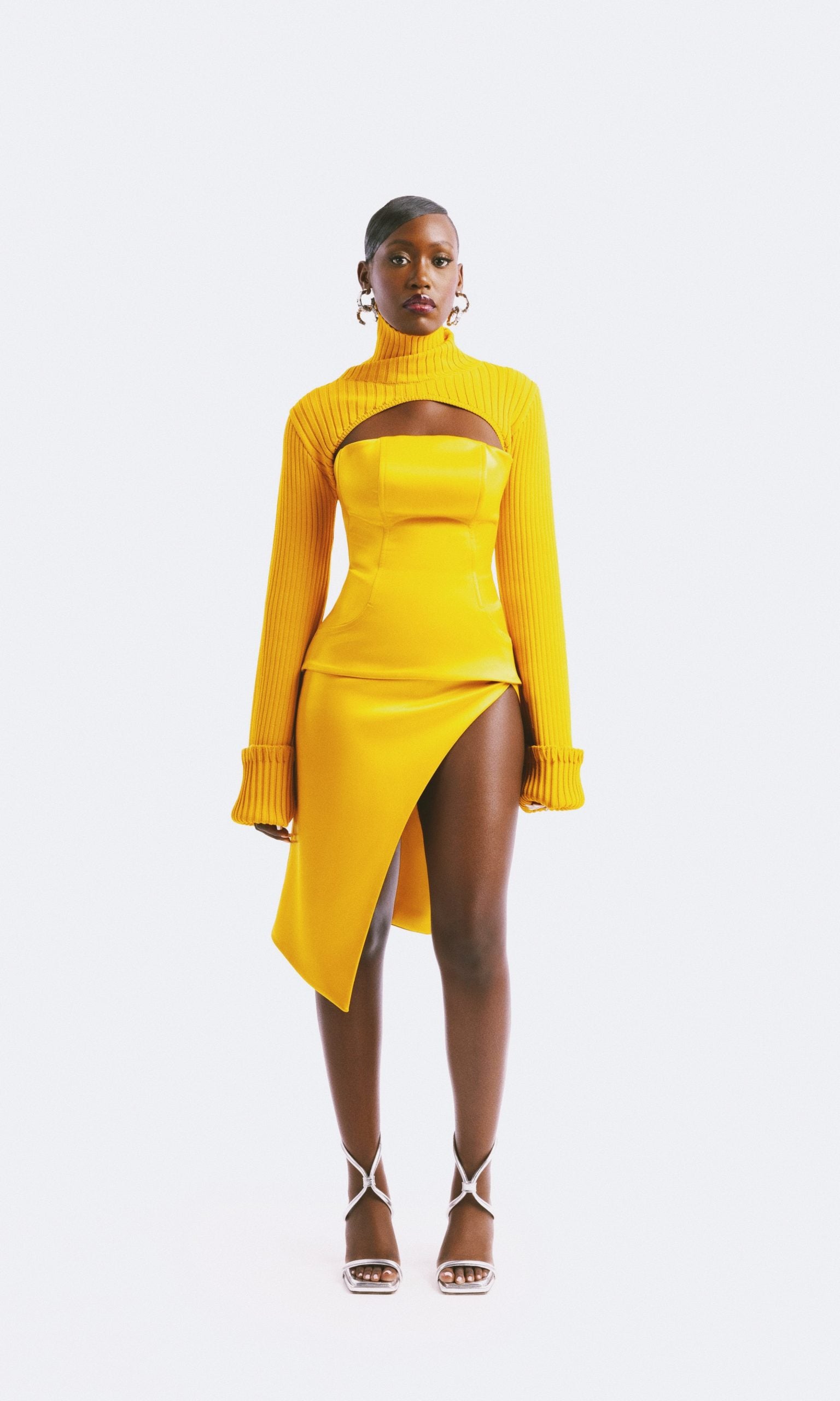 The “Amina” pullover is one of the most stylish ways to stay warm when wearing sets or dresses like the one pictured, which is also available for purchase on Hanifa’s website.