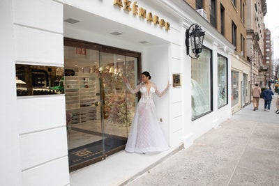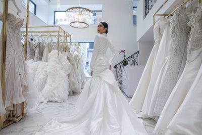 The level of art meets craftsmanship in the designs that the atelier conceptualizes for their clients is comparable to the level of detail associated with French and Italian couturiers. And the interior reflects that same essence; floral-covered walls, golden racks, golden trimmed mirrors, and marble floors — all a decadent framing for the exquisite bridal gowns displayed across the showroom.
