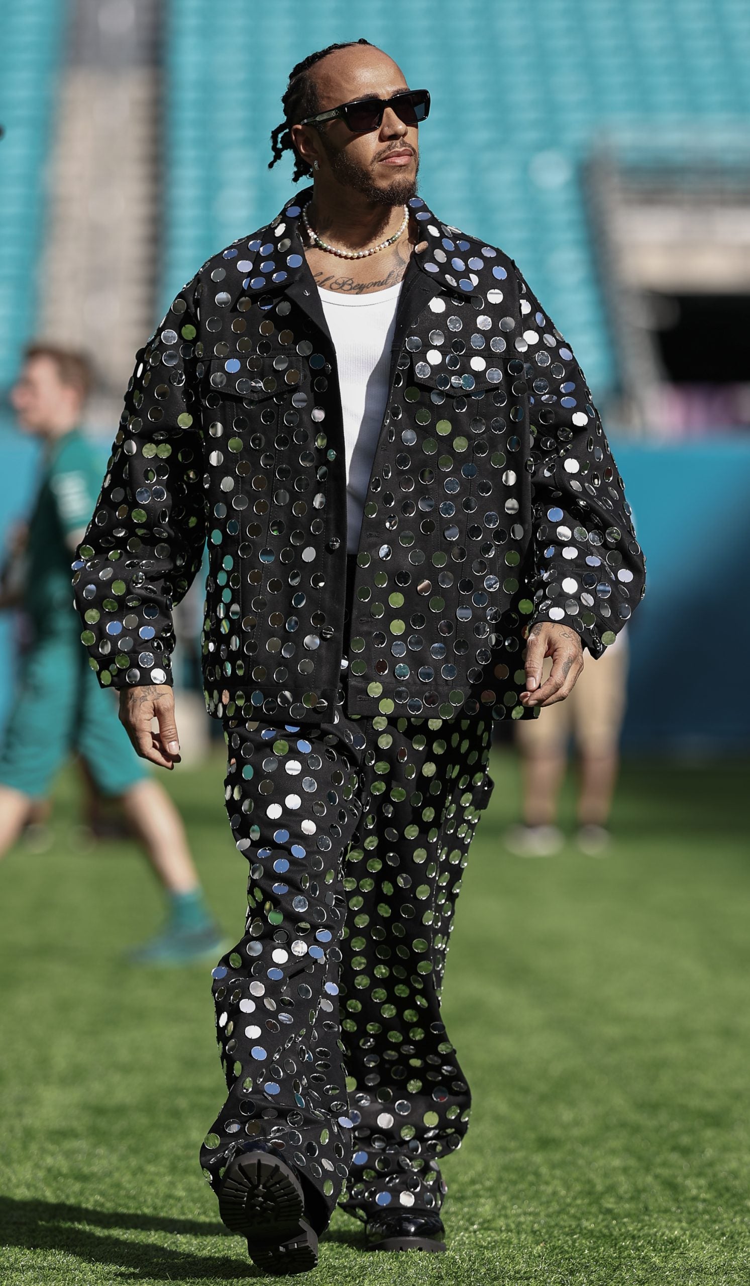 Ahead of the momentous race at F1 Grand Prix of Miami Lewis Hamilton wore a custom Marc Jacobs set. The two-piece set consisted of a black long-sleeved jacket and matching pants emblazoned with silver mirrored circles throughout styled by Eric Mcneal. A white tank was worn beneath and he also donned a beaded necklace in addition to a pair of military-inspired boots.