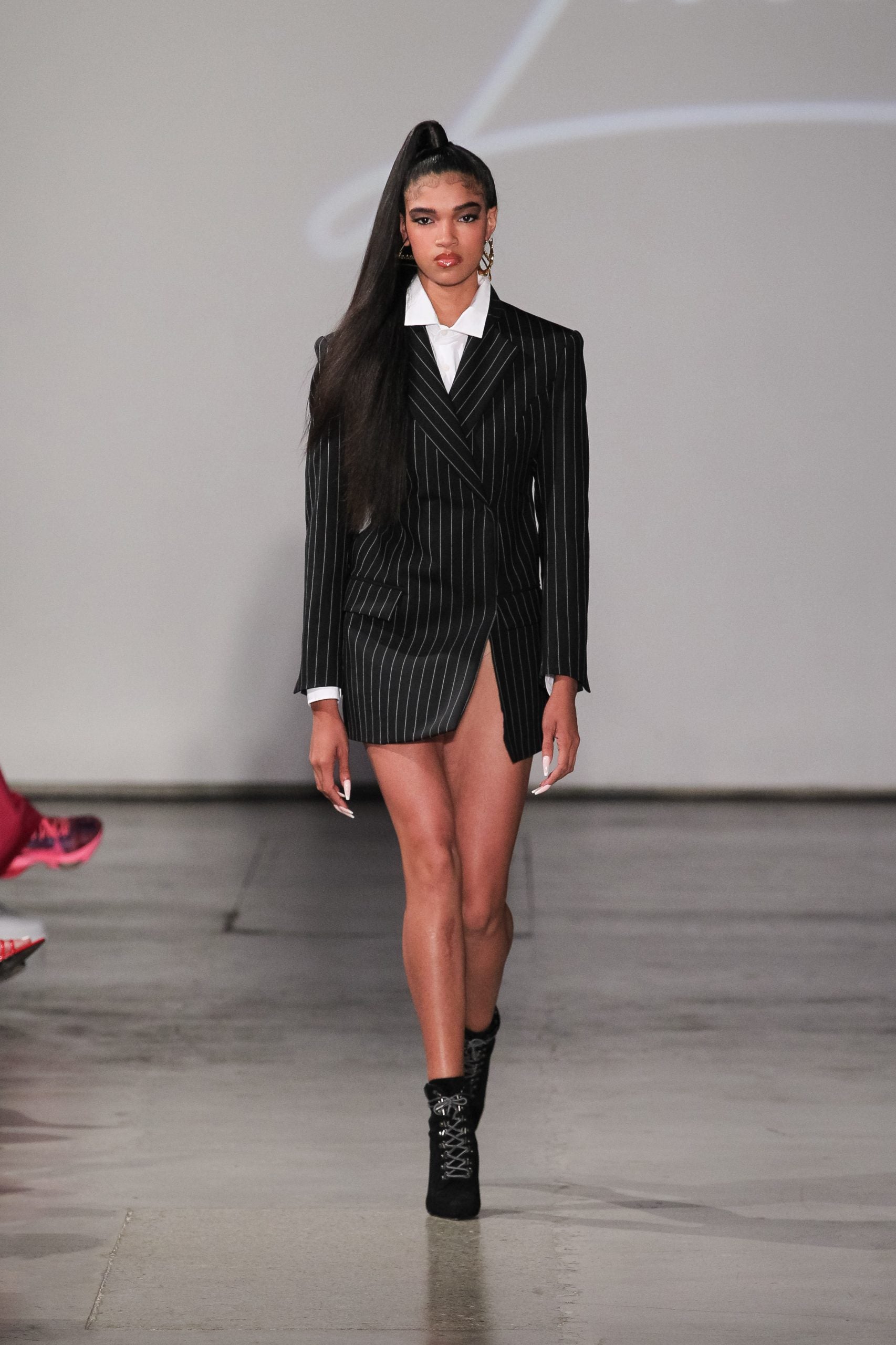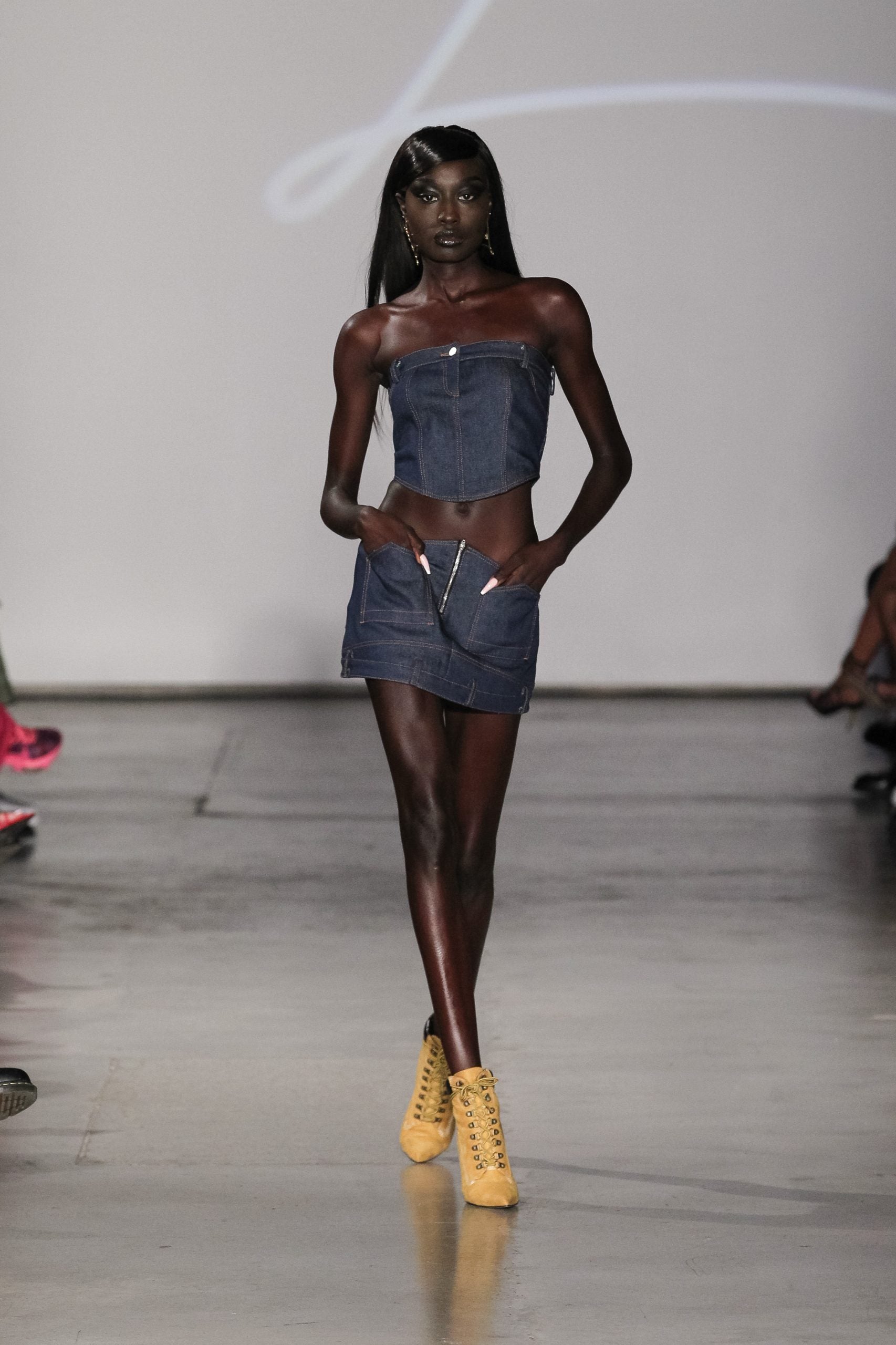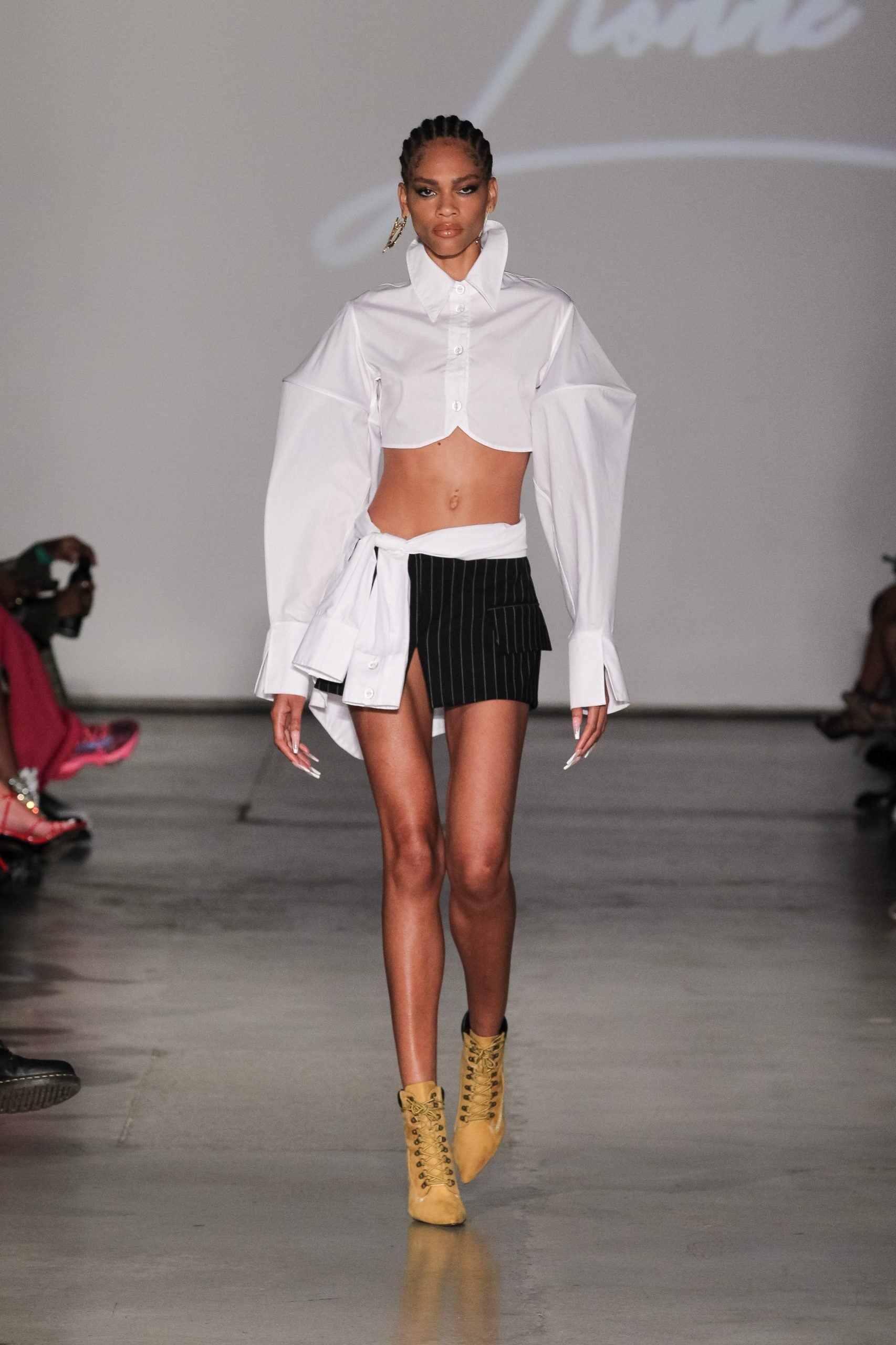 Over on the runway, models were mostly doused in black, save for brief moments of orange, white, and blue denim. However, an emphasis on the shade in high-sheen fabrics (there were tube tops, mini skirts, matching sets, and trench coats all in what look to be vinyl or patent leather materials) catapults the designs into a territory that is anything but quiet and minimal. In fact, elevating basics far beyond their norm is exactly what Fitzgerald does best, her knack for elongated sleeves, oversized collars, and off-kilter structural silhouettes coming together in unison on the runway. It’s an element that has quickly become a recognizable signature for Lionne, and Fitzgerald tells ESSENCE this collection is a natural progression, with growth, from the last. Beyond aesthetic choices, the collection signals other ways the brand continues to grow, as its first collection produced in Italy (Fitzgerald took fans behind the scenes on Instagram), with an emphasis on higher quality.