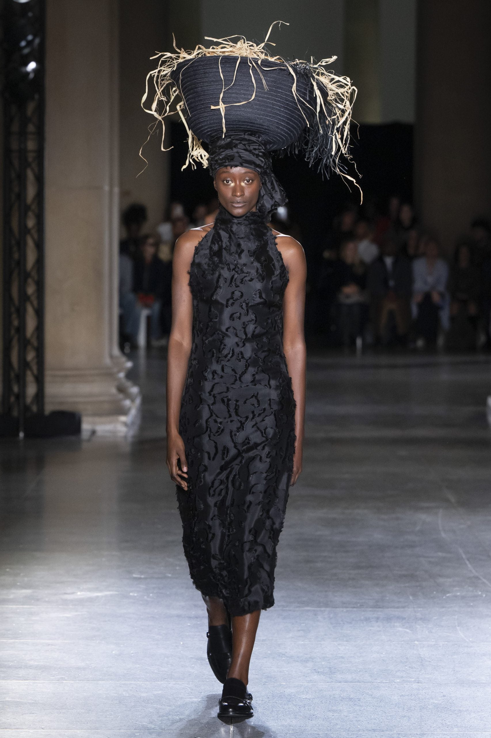 For Labrum’s A/W 2024 show, Dumbuya chose to zoom in on the artistic contributions of immigrant artists. “The reason why I’m telling this story today is because immigrants are the fabric of our society. I think we forget that,” said Dumbuya post show. Models walked the runway in silk rap ikat designs inspired by Afghanistan Turkmens tribes and draped capes symbolizing the “West African flair” Dumbaya and his team has made a signature of Labrum. But the message felt most salient in the collection’s headwear—custom hats made by milliner Lucy Barlow fashioned to look like daily objects–a suitcase, a woven basket, (even an Adidas duffle bag was also imagined as a headpiece) represented the belongings that become a part of an immigrant’s physical journey. Kufi hats rounded out its robust headwear assortment. But the piece de resistance was a showpiece inspired by an image captured by James L. Stanfield. Comprised of a display of flags displayed on a large frame, the final look referenced “countries that have been involved in key migrations throughout history,” according to a release.