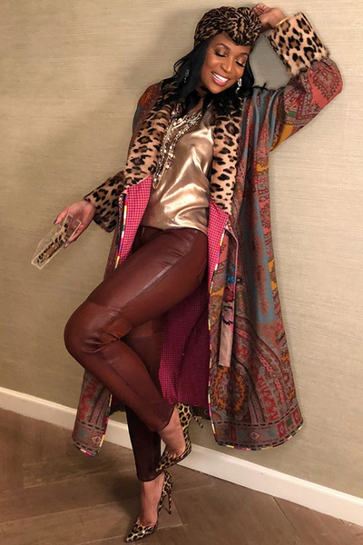 Animal instincts are front and center with Marlo’s printed head wrap, jacket and heels.