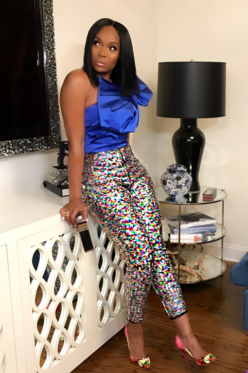 Marlo is confetti-ready in her sequin print pants and asymmetrical-bow top.