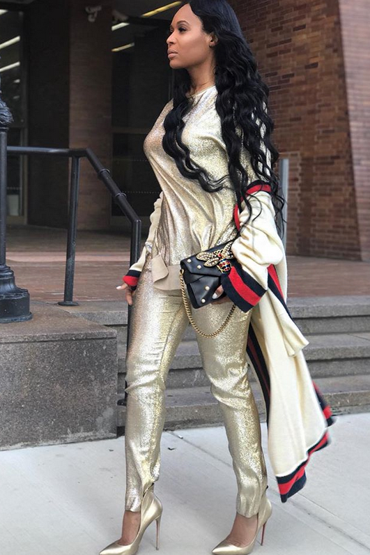 Shimmer and shine; Marlo slinks in a gold top, pants and heels topped-off with a Gucci oversized cardigan and jewel-encrusted bag.
