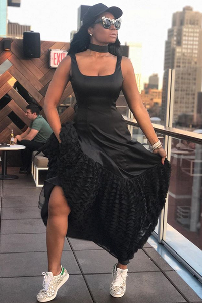 ‘Evening wear in the daytime’ is a trend, and Marlo pulls it off easily with her black ruffled gown and customized sneakers.
