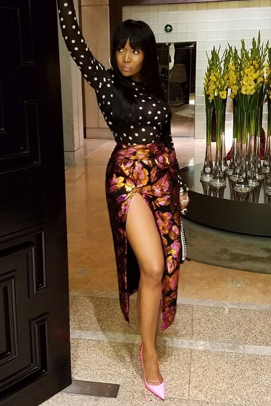 Skin is in with Marlo’s Versace bandeau and ruffle skirt.