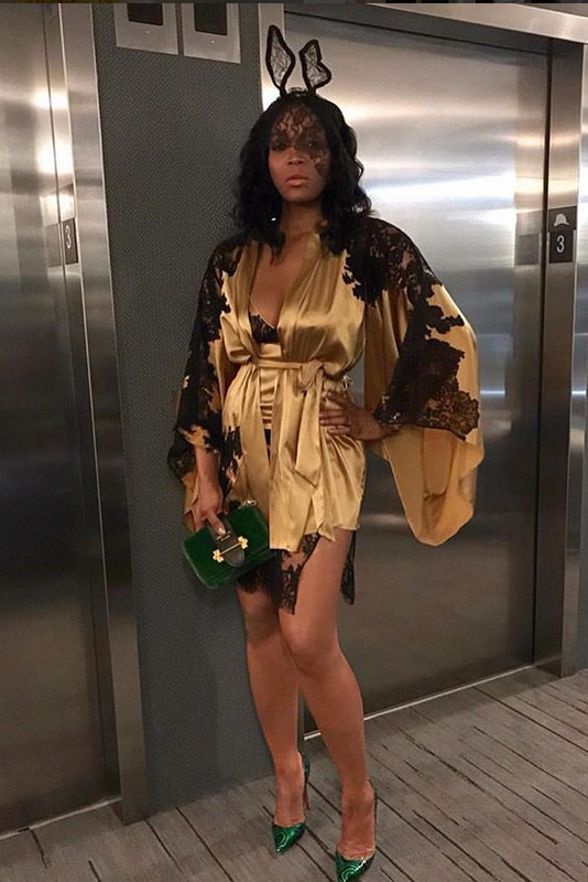 Money bunny; Marlo wears a luxe silk camisole and robe detailed in lace, with a pop of green for her bag and shoes.