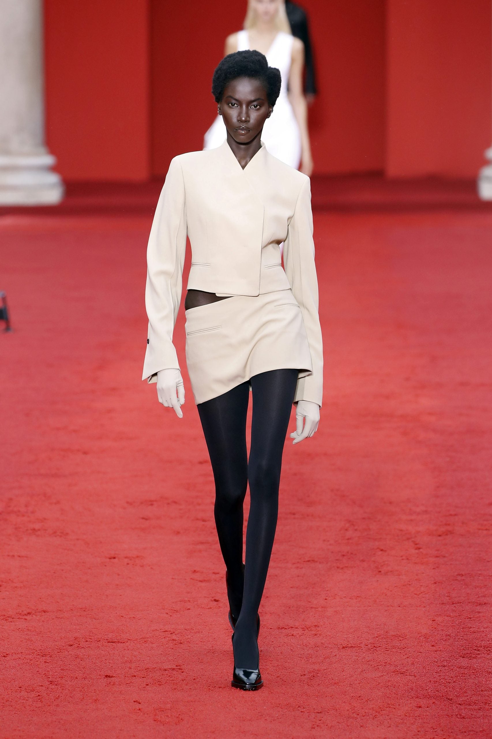 The color palette and using white and this buttery suede tan as palette cleansers in between the fiery red looks and leather pieces were delicately intentional. Look 24, this voluminous white knit sweater, with a slitted knit skirt paired with a large suede hobo bag, screams quiet luxury. Then the following look is a punchy red blazer dress, with red tights, a mini-bag, and heels. It’s a masterclass, as Davis uses this method continuously throughout the collection. The menswear was also particularly special. It was refined and impeccably tailored (like look 2, a full monochrome suede suit and trench) yet also delicate and sexy, with draped asymmetrical tanks in ombré and leather suit-short sets.