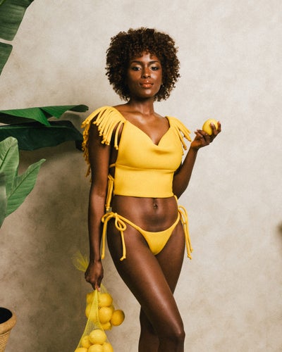 “The ‘Tell Me More’ Scuba Fringe Top is the main attraction this season”, Muehleder tells ESSENCE. “It’s guaranteed to make a statement, and can be paired with the ‘Boni’ Bikini Bottom on the beach and the ‘Boni’ Scuba Shorts by the bar.” Versatility and variety are the overarching themes of the new swim collection. “Every piece comes in the same color, so you can color block or match them up for a look that is customizable and signature to your taste,” Muehleder explained. Each piece is available in five colors – Mango, Lavender, Electric Orange, Kelly Green and White.