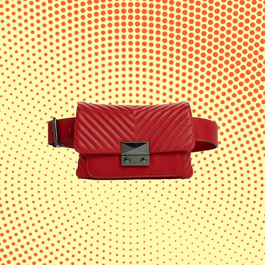 This is another non-traditional style of the belt bag perfectly done by Nanushka. We’re obsessing over the uniqueness and high-style look of this accessory. There are so many ways to wear this pack without taking away from its elegance or your outfit. We simply suggest pairing this belt bag with pleated hip pants and a cropped wrap top.