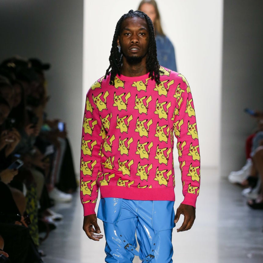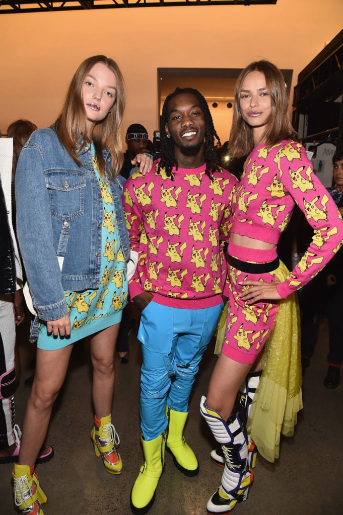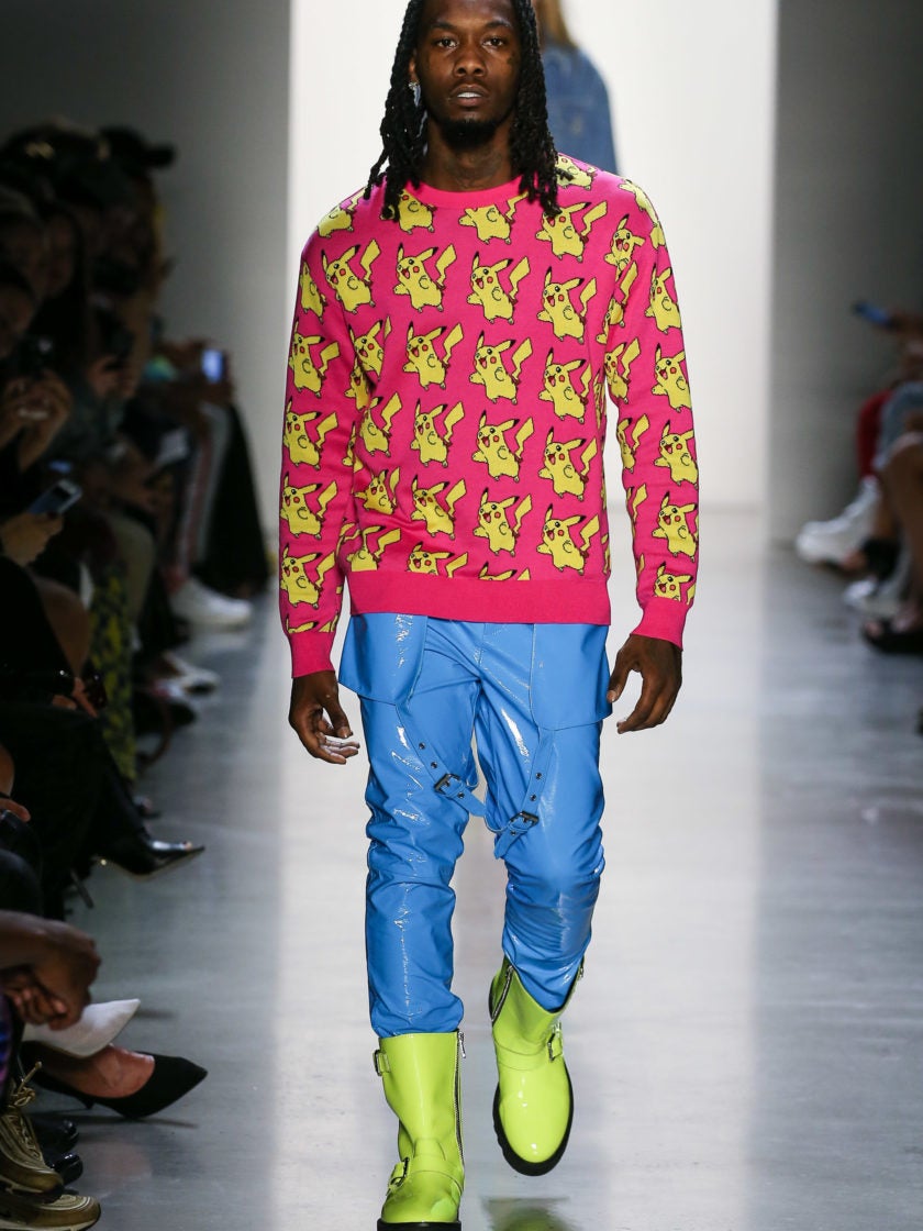 Without any grand gesture or announcement about him taking the stage, Offset proved that he was ‘bad and boujee’ by smoothly gracing the runway (just as any professional male model would). He counted his steps and paced his stride while modeling a neon-pink Pokémon sweater paired with electric blue leather pants and lime green boots.