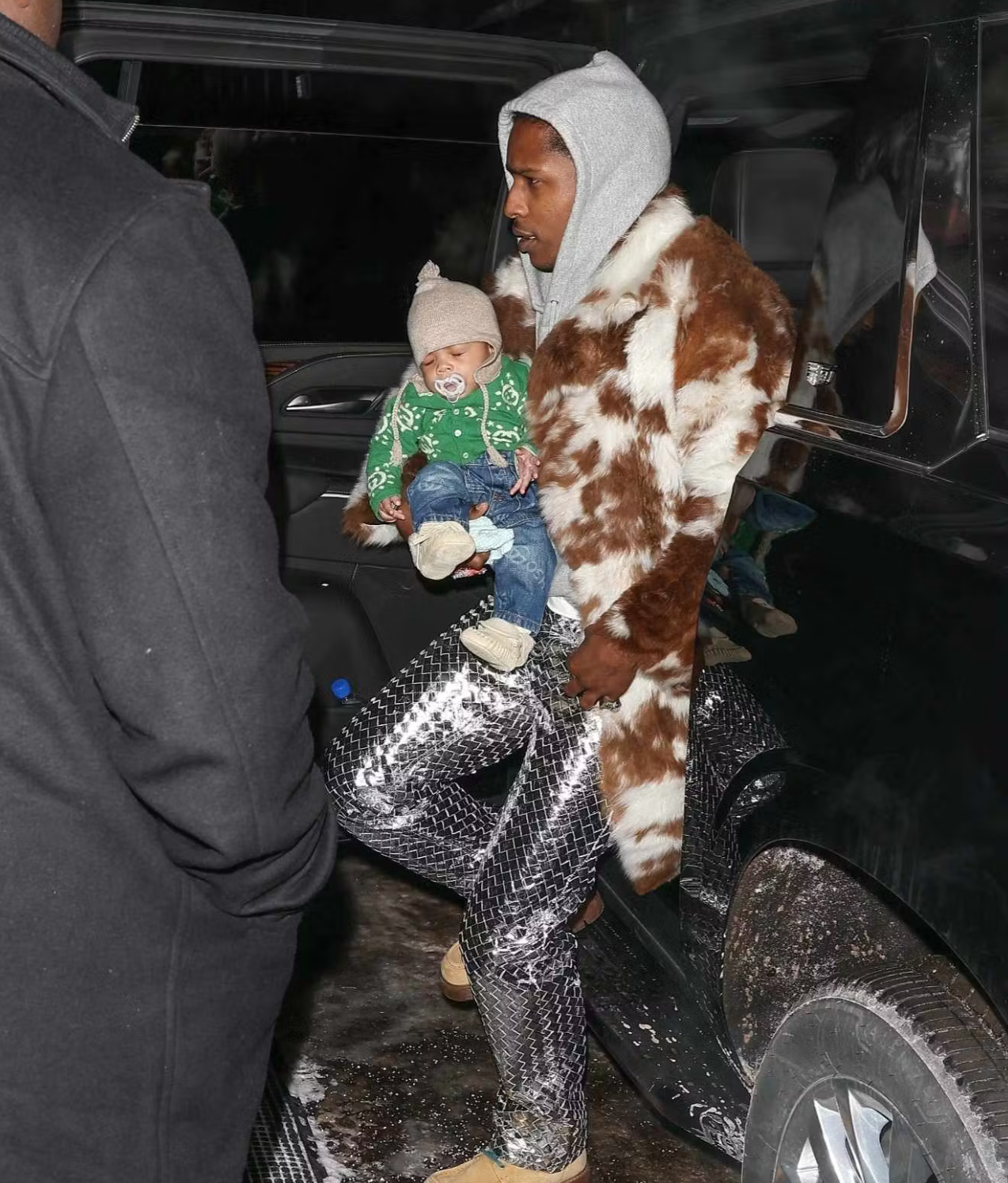 Aspen may not be every baby’s preferred destination, but Riot Rose seems at ease in Rocky’s arms. He’s wearing a green Gucci cardigan with the iconic logo in white, effortlessly embracing logo mania. Paired with medium wash jeans, light tan baby moccasin booties, and a matching beanie, his ‘fit exudes baby A$AP Rocky. I can’t help but wonder whose style Riot Rose will ultimately emulate–his mom or dad’s?