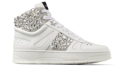 A Jimmy Choo is unlike any other shoe. The legendary HAWAII trainer gets a makeover! HAWAII Hi-Top is a high-top silhouette made of white Nappa leather with a prominent cuff and stripe embroidered with over two hundred glittering crystals. The lace-up style is finished with iconic star eyelets, perforations, and Jimmy Choo embossing at the heel, among other embellishments. The hefty sole creates a lengthening appearance on the legs.