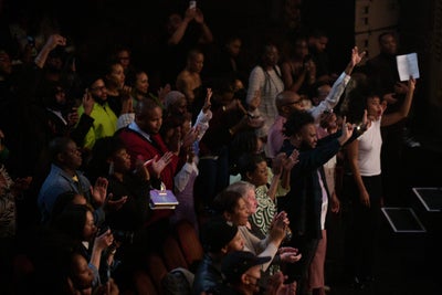 “The Glory to Glory performance is a special and important element to the Eldorado Ballroom experience as a whole,” Solange tells ESSENCE. “When curating the series, we were very intentional about the details of each performance. Everything, down to the timing of Good Friday, lent itself to the celebration of devotional and uplifting praise. With the help of Twinkie Clark and The Clark Sisters, this evening felt like going home to church – for so many people, this was a homecoming in a sense.” And that it did. The audience, which included fashionable faces like Telfar, Raul Lopez, and Steve Lacey, clapped and danced as the spirit of praise and worship took over the Beaux Arts-style opera house.