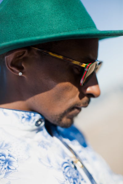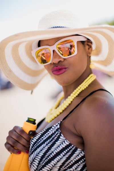 Reflective sunnies and a wide brim hat offer stylish sun protection.