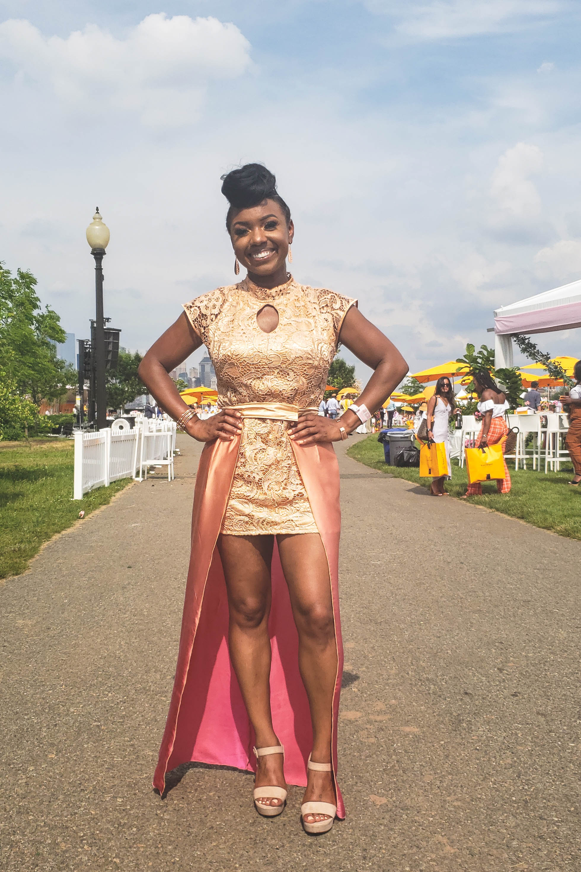 North Carolina native Alexis Avent looked radiant in a gold mini dress with oversize ruffles from Asos. Lace up shoes, sunglasses from Nordstrom, and hair inspired by Janelle Monae complete her look.