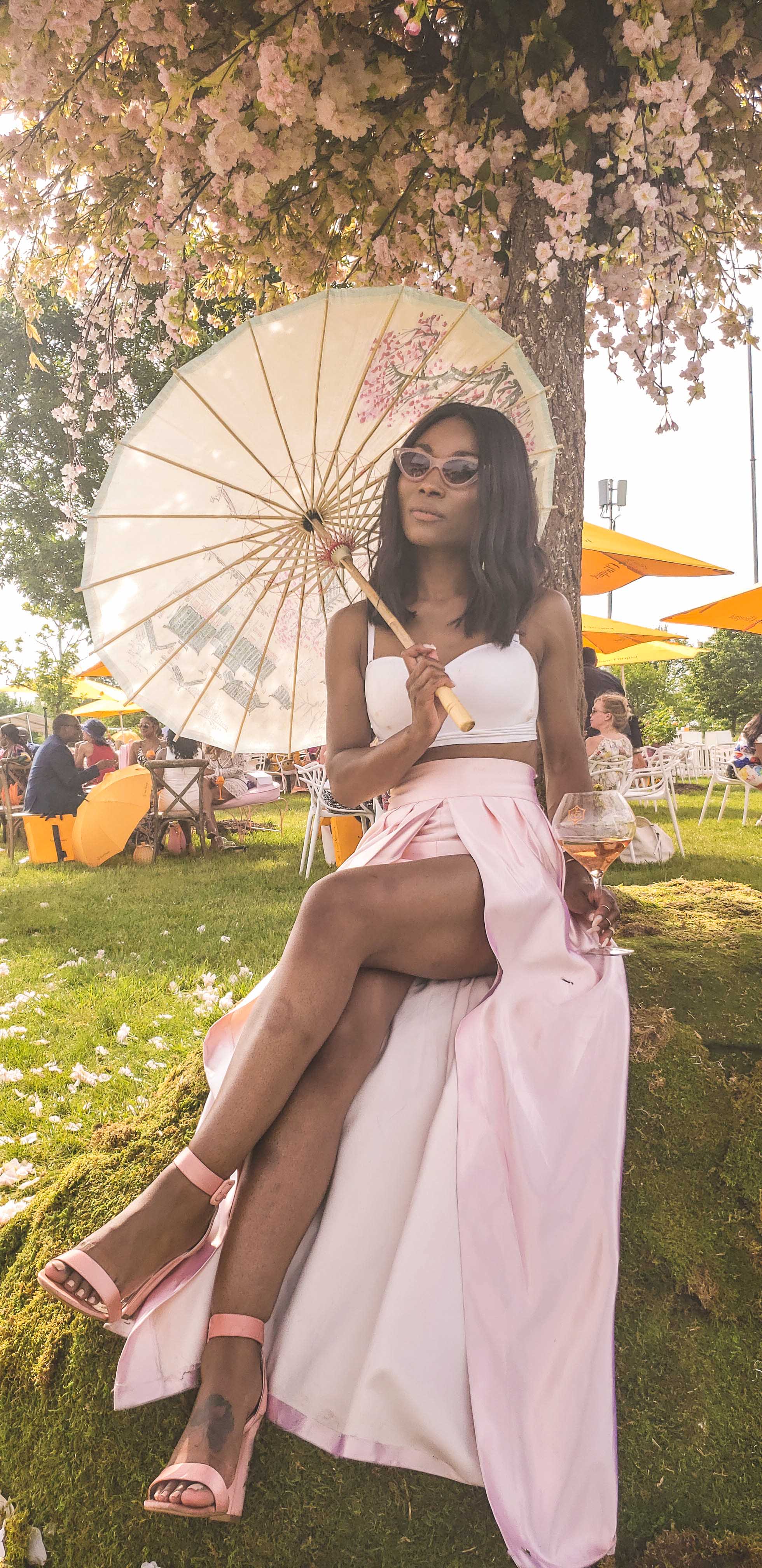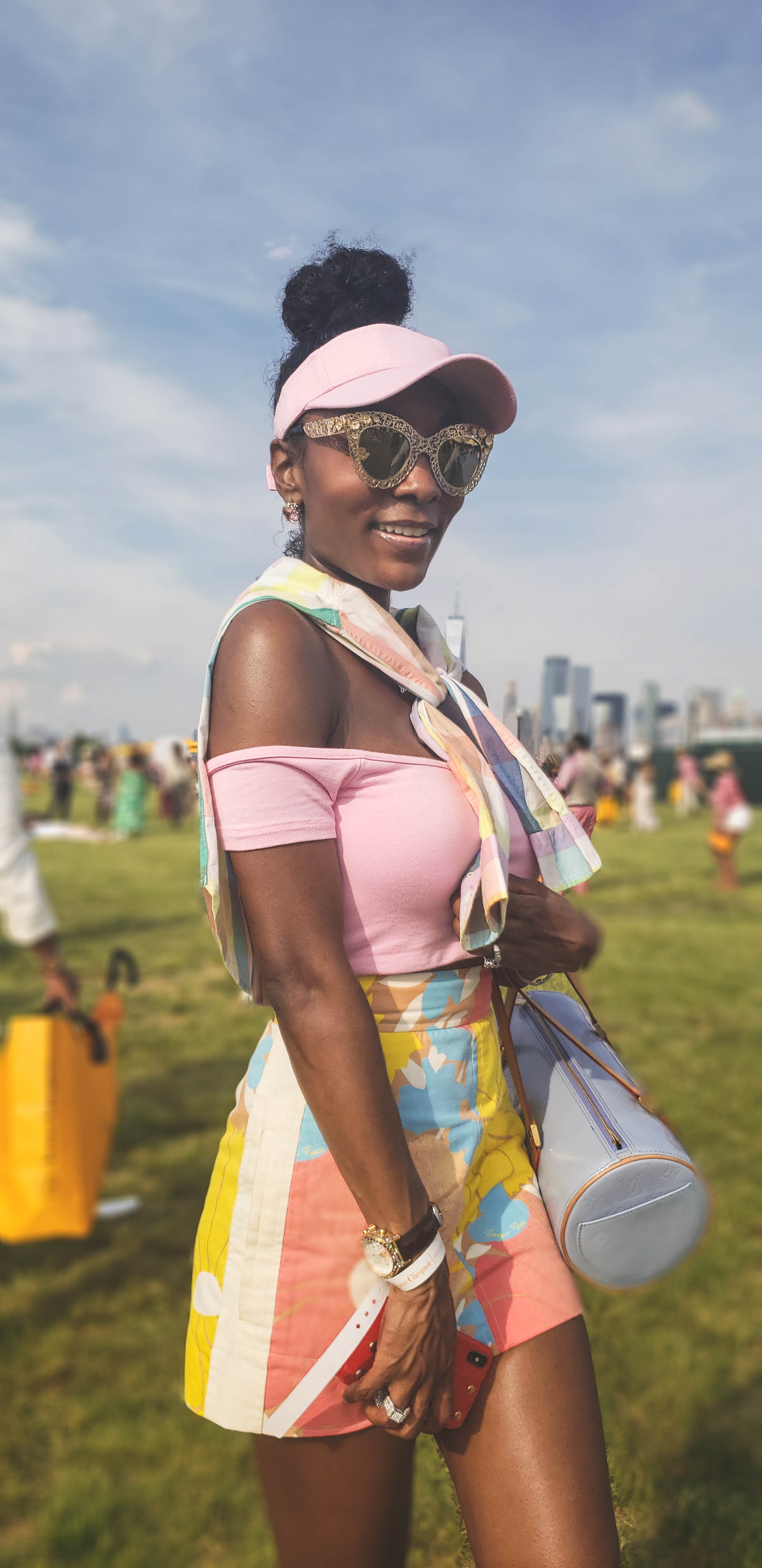For the VC Polo Classic, Cari Rene aka @LayllahStyle went with a baby pink custom design short/skirt combo from Chai Design Studio and a top from the lingerie section at Target. To round out her look she ordered her pink tint sunglasses and parasol from amazon.