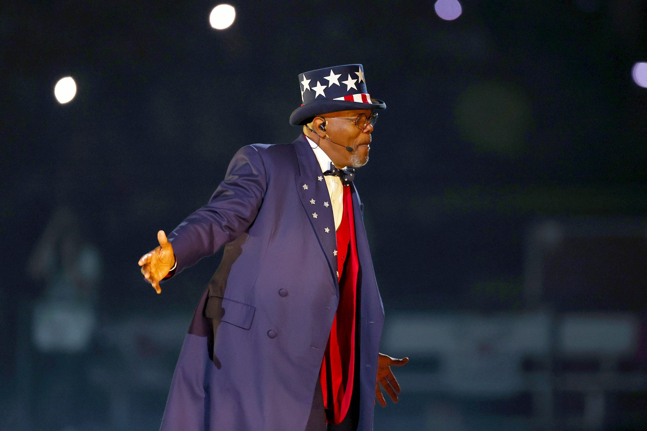 Hollywood legend Samuel L. Jackson served as an announcer ahead of and during Lamar’s performance. In a look channeling the symbolic figure Uncle Sam, Jackson wore a custom Bode outfit consisting of a three-piece suit and an overcoat cut from Italian wool suiting. Detailing included hand-embroidered stars placed throughout the lapels and bow tie. Jackson’s hat was also trimmed with suede.