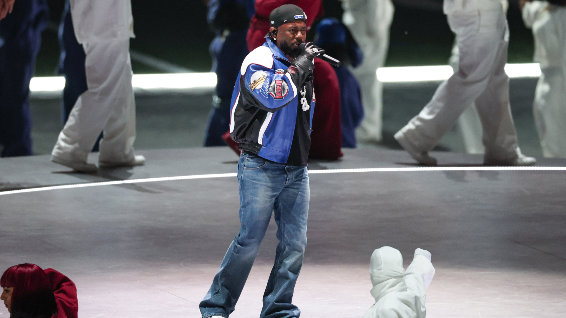 Kendrick Lamar utilized the Super Bowl stage to unleash an outfit that had the internet talking for hours. The centerpiece of his ensemble included a custom “Gloria” blue leather sports jacket by Martine Rose. Archival sports paneling was seen throughout the outerwear piece. Lamar also wore a pair of Celine denim pants with bell bottom detailing and a chain that alludes to a line in his Grammy Award-winning song, “Not Like Us.” Lamar’s look was styled by Taylor Mcneill.