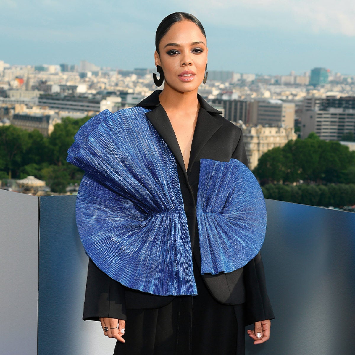 We wanted Tessa to start off the MIB press tour strong and agreed that this oversize suit with cobalt blue pleated panels would set the tone. Along with our team, she is a huge fan of Robert Wun, the designer. The black suit honors the film while the blue panels make Tessa appear powerful and feminine