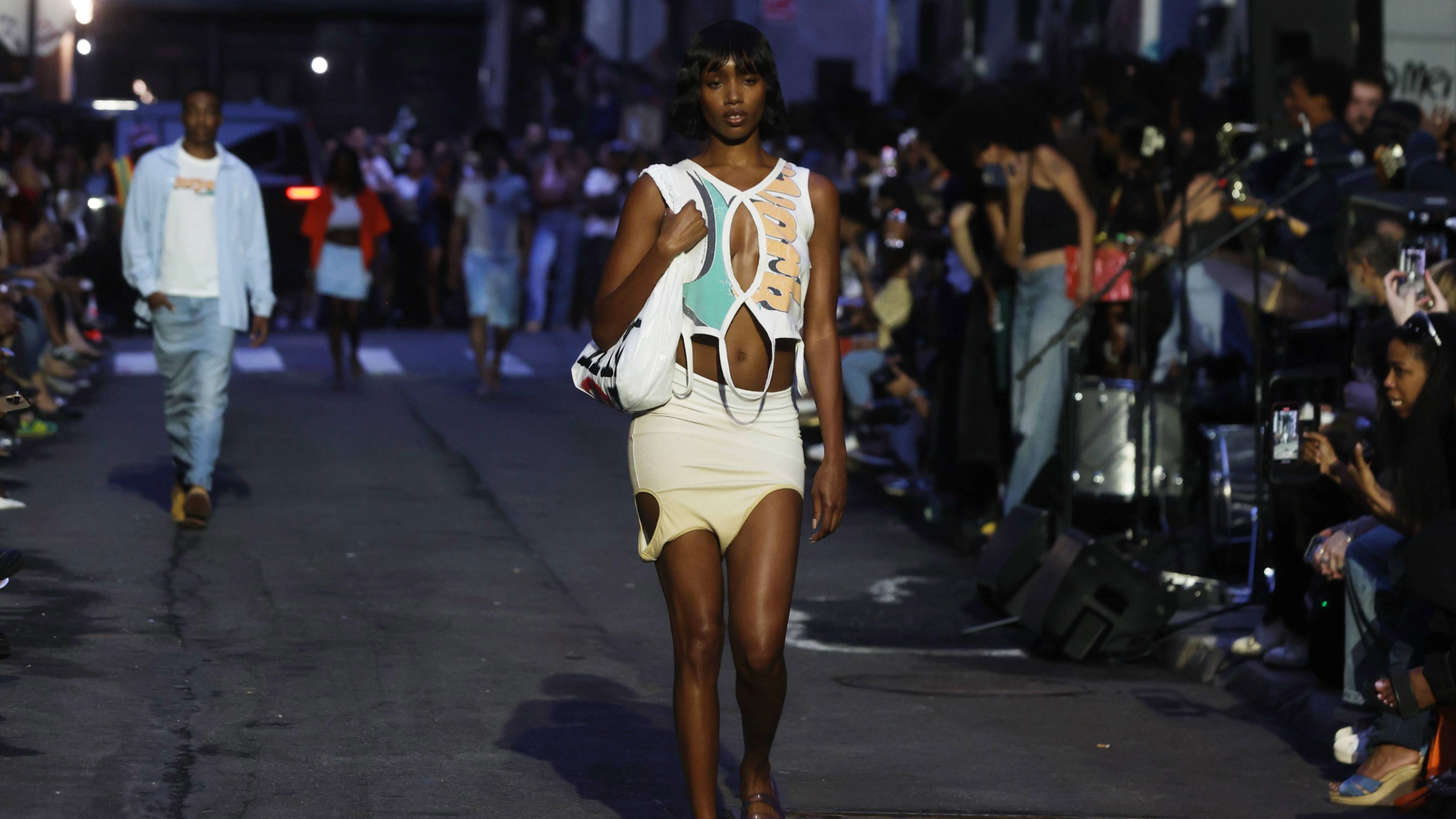 Though it was a sticky and humid day, one ideal that rang loudly is how compelling fashion made for the people can be. Rather than solely leaning on designing for moneyed families and those with means to drop thousands on new pieces each season, the designer opts to create from his heart. And since his heart has always been focused on his community and the longstanding Telfar fanbase, each design and each sold-out bag has been created from an earnest space. For this special show, that meant off-kilter polos, loose-fitting white garments with colorful floral and logo detailing, eloquent matching sets nodding to the African diaspora, skin-tight two-piece outfits, and updated jelly logo sandals went down the runway.