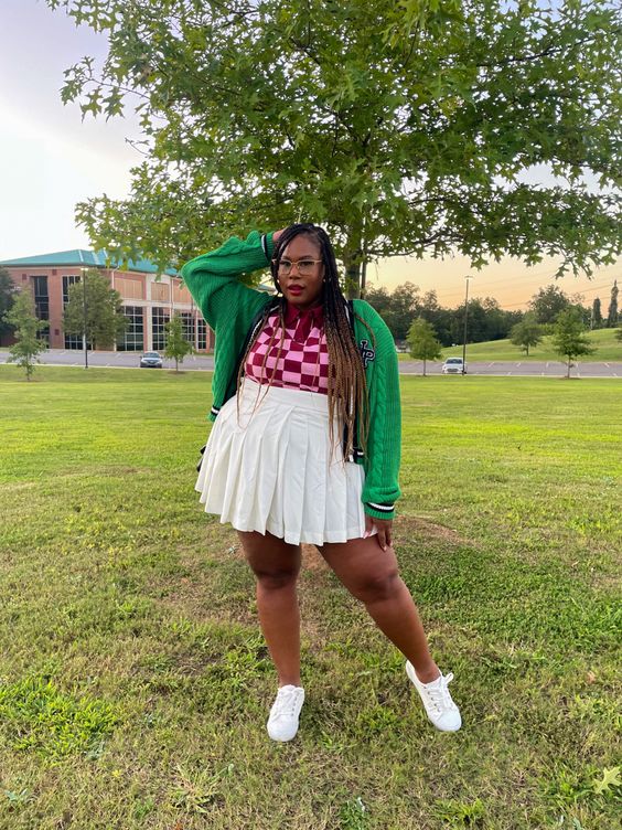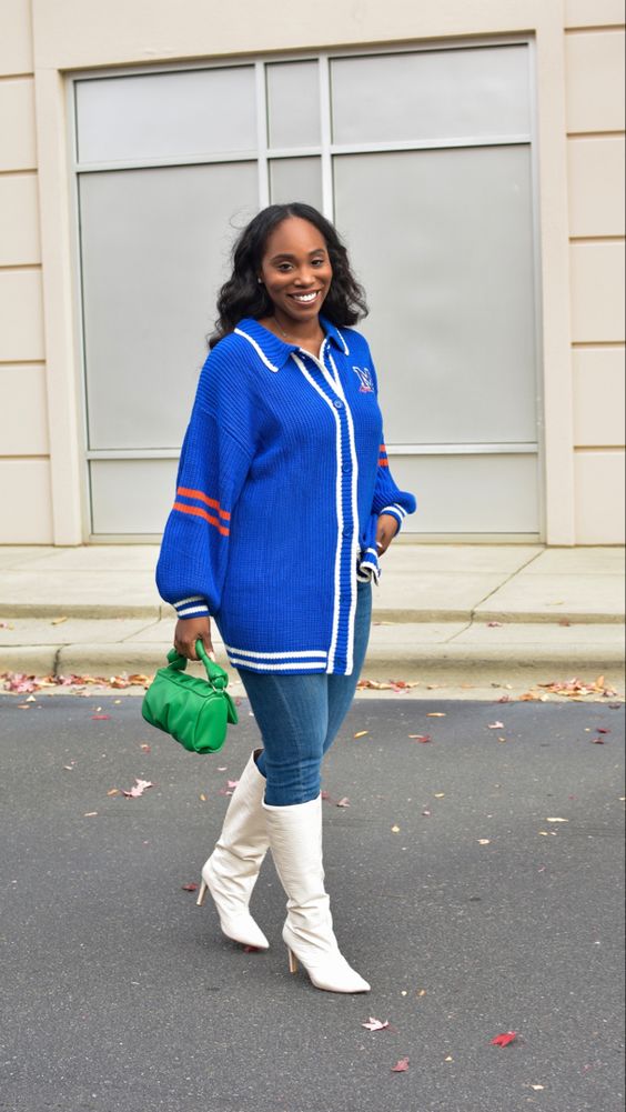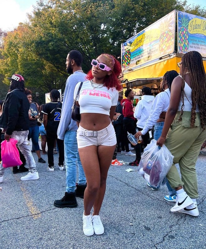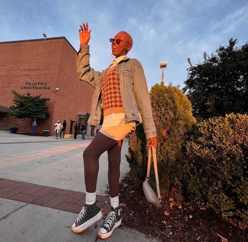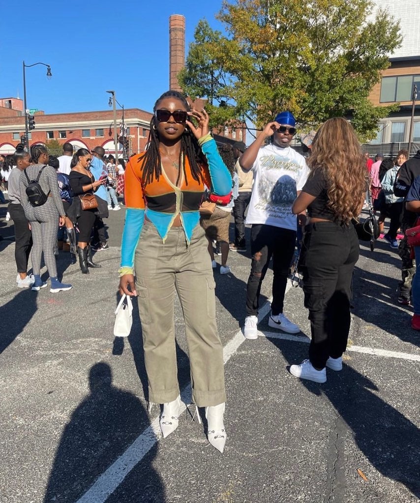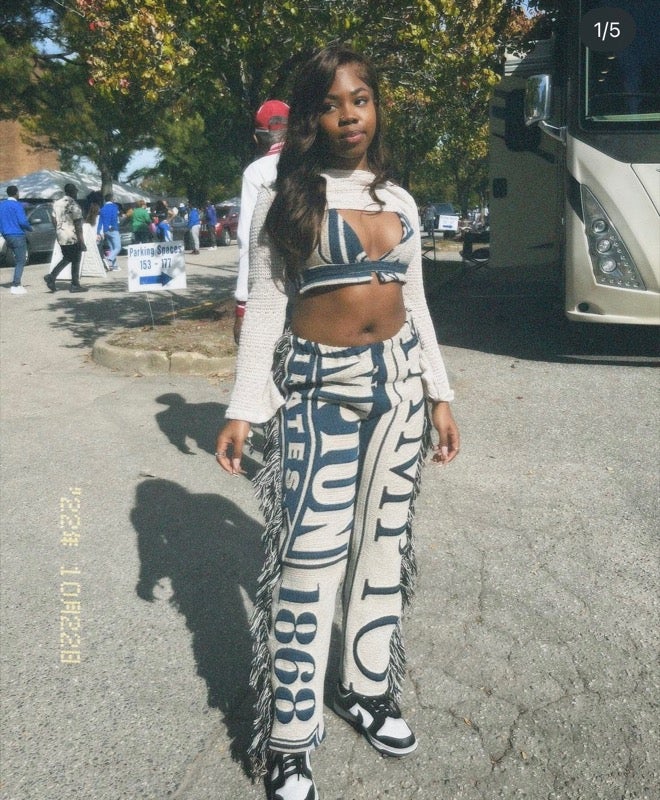 Looking at our chosen creatives, we see a direct correlation to Pinterest’s research, with knitted vests and baggy cargos popping up. Still, we also see HBCU merch turned into fringe-filled pants, oversized shirts, and redesigned tops. There’s a substantial sighting with color, showing that style is moving a bit past traditional autumnal hues with bright greens, pinks, and purples.