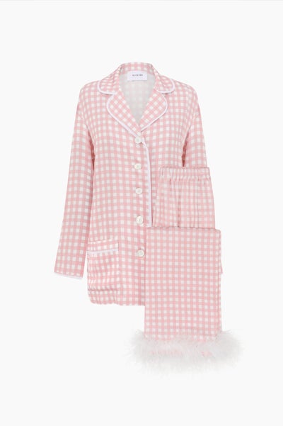 Sleeper Party Pajama Set with Feathers in Pink Vichy