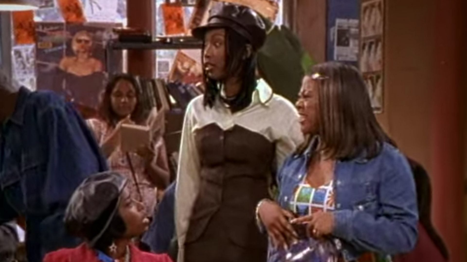 Among the ‘90s trends the fashion collective has happily welcomed back as of recent is the classic bodycon tube top. In this episode, Moesha prepares for a blind double date with Kim, and this look is almost enough to solidify the tube top’s place in fashion from here on. Additionally, we catch stolen glimpses of Moesha’s nylon Prada shoulder bag in this scene, another style which has regained popularity as of late.