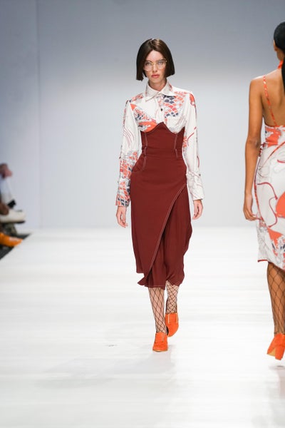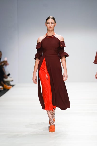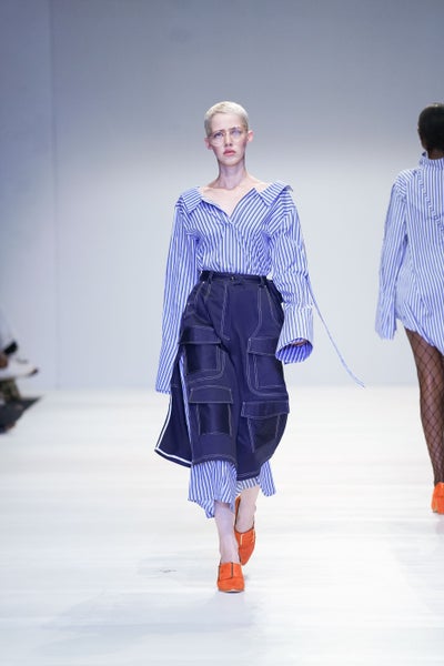 The escape to the wild can be seen in the hiking gear rope found on his pieces, the Koi fish print and perforated fabrics. Magugu takes a page from the design of cargo pants, which can be seen in his multi-pocketed denim piece — because we all need extra places to carry our favorite face serums and lip stains, even when we’re taking a self-care moment in the wilderness! No? Just me?