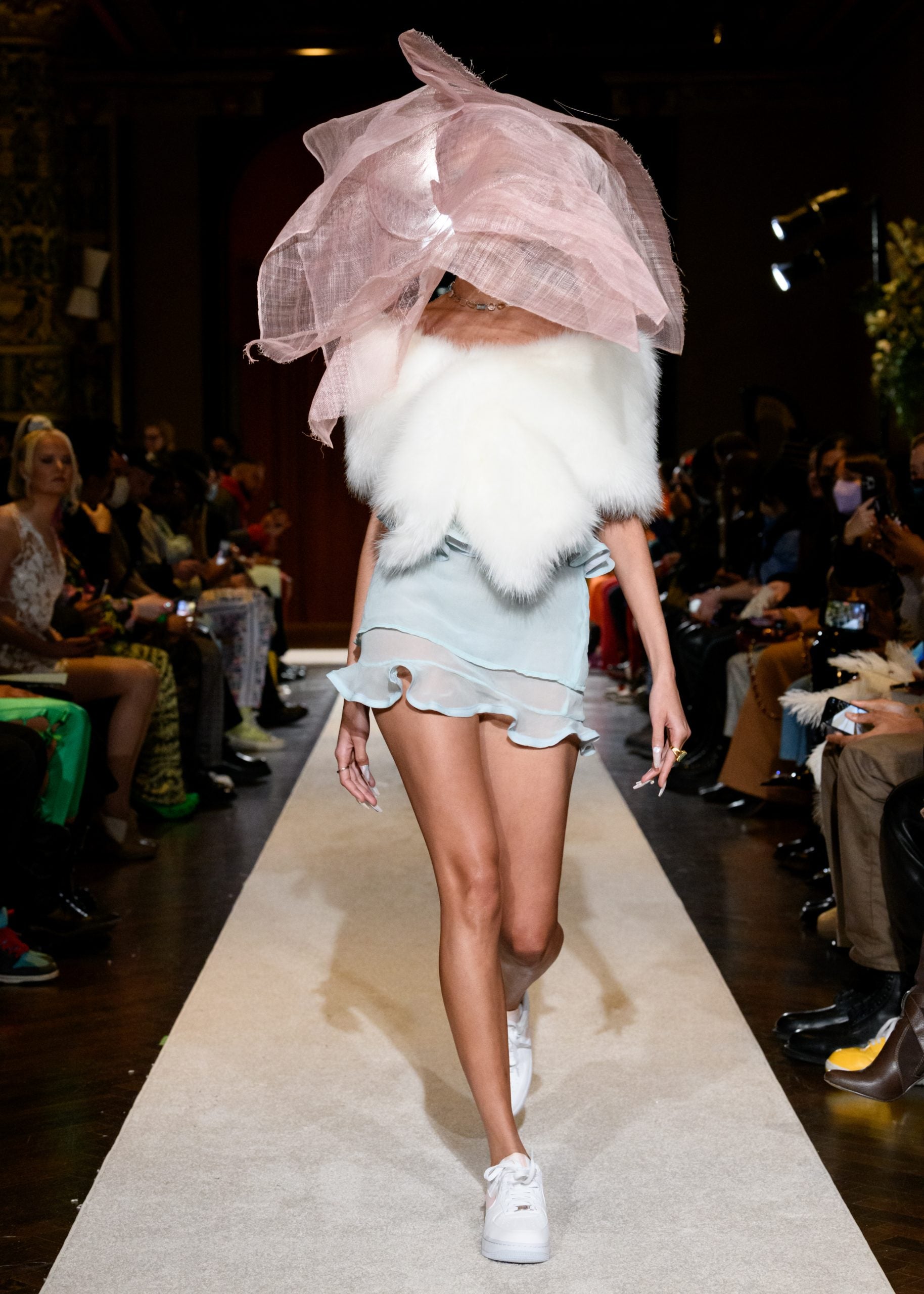 Amidst the sheer fabric, feathers, and ruffle details was a silk slip dress that read, “You were supposed to protect us.” Adeola was referring to the End SARS movement in Nigeria (her native country), which she heavily advocated for on her social media and is now making clear that her activism is something that she continues to walk with. Rather than just showing pretty clothes, Adeola disclosed a piece of her mind. “I wanted this to be beyond apparel. I wanted this to be an experience,” she tells ESSENCE.