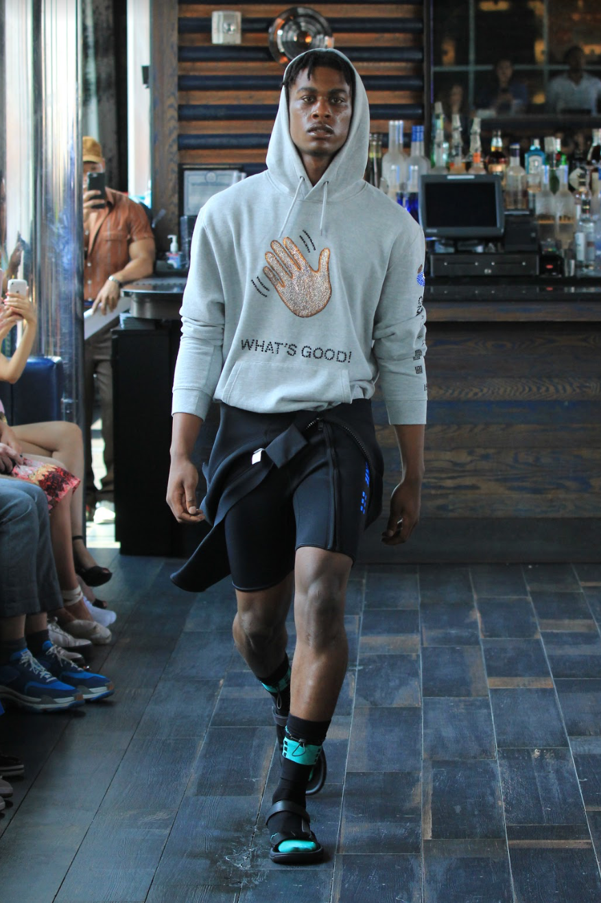 Black fashion designer Christopher Bevans partnered with Google Cloud to present the Spring/Summer 2019 collection for his brand, DYNE. The theme of his show was “Future Nomad” and focused on highlighting his hometown of Portland, Oregon. Tailoring and lightweight wools, and upcycled fabrics reigned supreme here, with models in face paint.