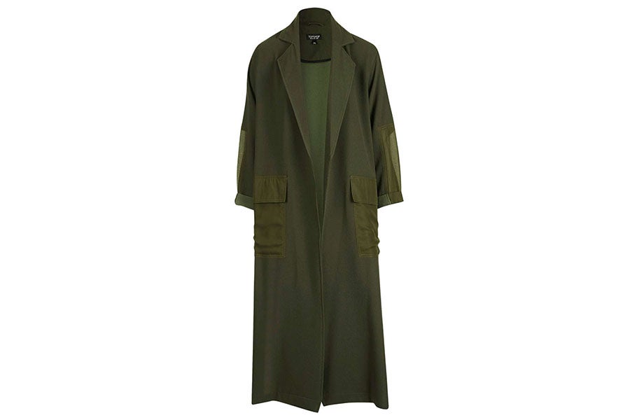 Duster coats are appropriate for every season and this textured one in olive green is especially perfect for fall and to pair with your skinnies. $135, topshop.com.