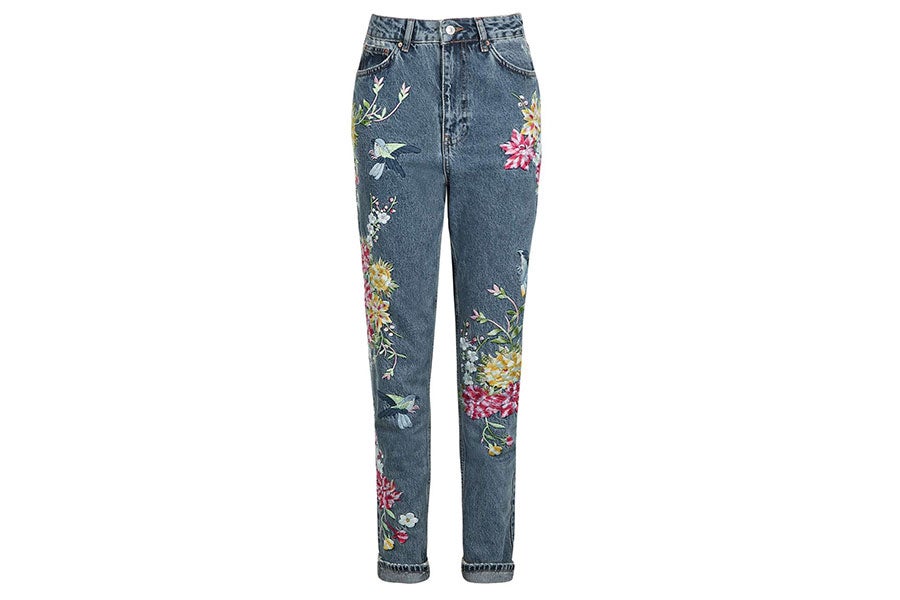 Upgrade your denim wardrobe with these fun floral embroidered high-waist mom jeans. $130, topshop.com.