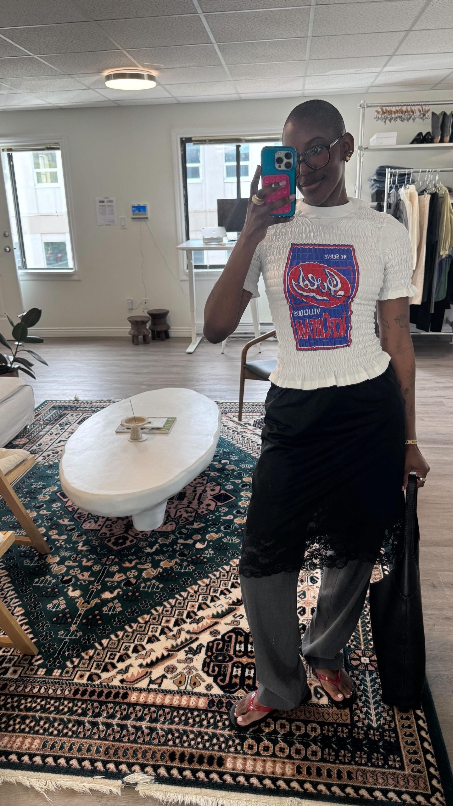 Marketing consultant Sharla Farrell puts it plainly. “Rihanna wore one of his dresses, that blue one with ‘I’m retired’ across the chest, and I immediately wanted one.” Farrell isn’t alone. The virality of that dress wasn’t accidental. It’s part of a long tradition of Black women creating and amplifying trends on Instagram, TikTok, and beyond. “Black women have always innovated out of necessity. That’s what Conner’s work taps into—not by mimicking, but by listening,” Farrell shared.