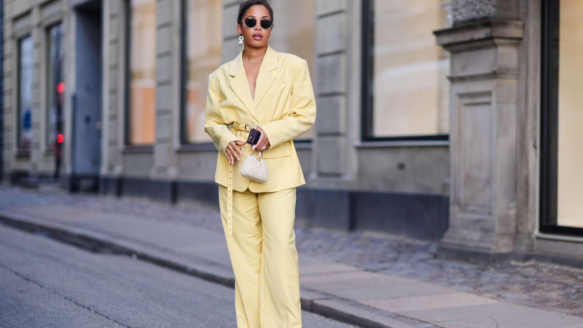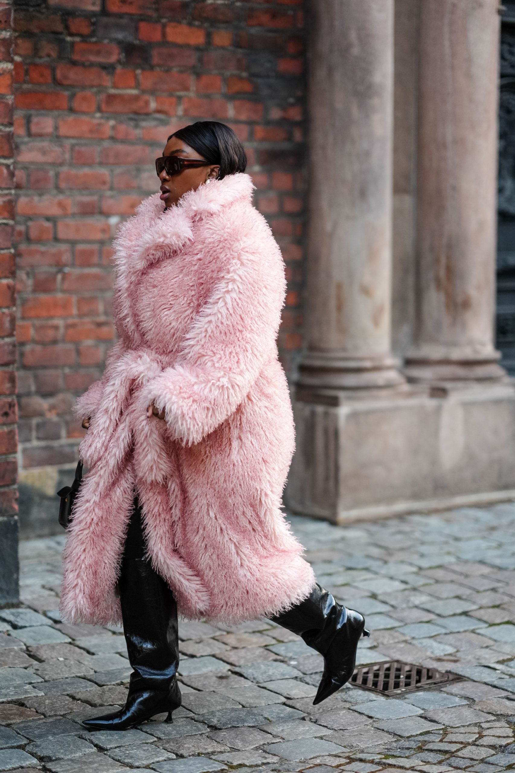 Baby pink may be an unexpected color to style, but try just adding it as a pop of color first. For example a fuzzy jacket to layer over jeans and a T-shirt is an easy start. If you’re comfortable with color, a head-to-toe baby pink look through a matching knit set or a knitted dress would be the best option.