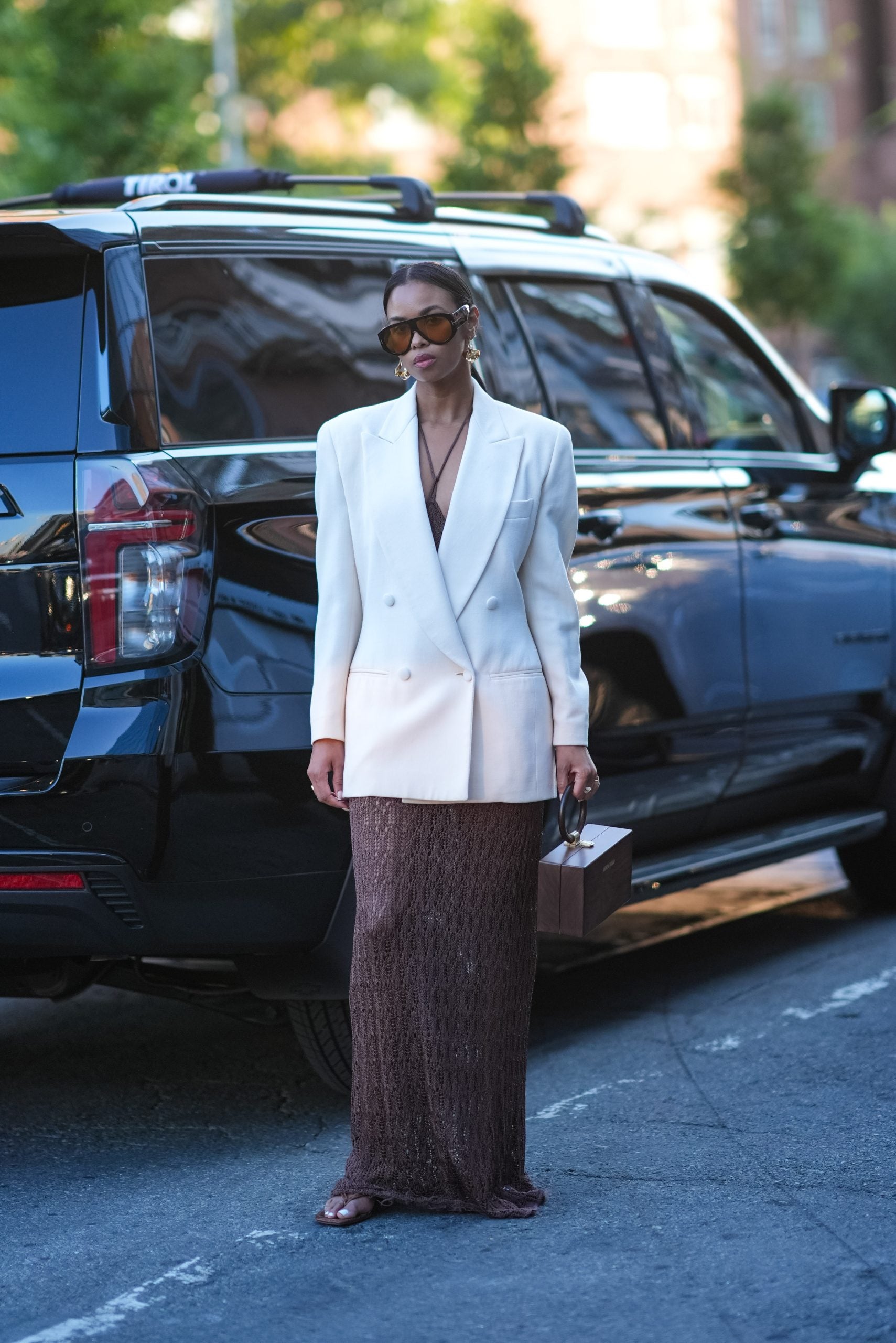 The easiest way to wear winter white is in a fur coat to layer over either an all-black outfit or another monochrome look. Luckily, white goes with everything. If you’d like to opt out of a short or long fur coat, try wearing a pair of cream pants and chic oversized white sweater for a look with added dimension and texture.
