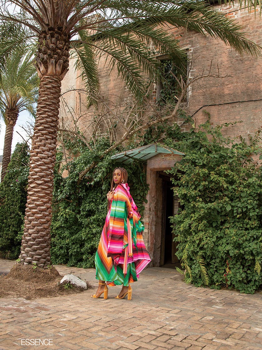 In all the places where Rae lived, her childhood—like so many little brown girl coming-of-age stories—was defined by a sense of otherness, of being too skinny, too thick, too light, too dark, too Black, too wannabe. In Maryland she was a fly in the churn of buttermilk; in Los Angeles she was an oreo. “My parents helped me and they hurt me,” she reflects. “My mom was extremely pro-Black, and I believed her. My dad is Senegalese, and I grew up around my dark-skinned cousins and just thought that they were the most beautiful women in the world. I was surrounded by beautiful dark people. And then middle school hit, and I was like, Oh, they think I’m ugly. They think I’m big. They think I’m unattractive. I went back to my mom like, ‘What the f—k?! Y’all lied to me my whole life. What is this?!’ I started realizing, Mom, you’re light-skinned. So I don’t know what you were talking about. It’s not like you can relate to being dark. And your hair is not the same texture as mine. So what do you know about telling me I’m beautiful? Why would you lie to me? That definitely had an impact on how I saw myself.”