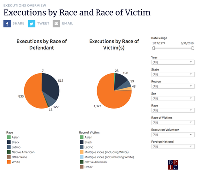 Additionally, nearly 80% of murder victims in cases resulting in an execution have been white, even though nationally only 50% of murder victims are white, i.e. those who murdered white people were found more likely to be sentenced to death than those who murdered Black people, according to DeathPenaltyInfo.org.