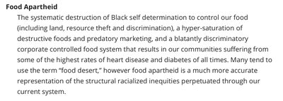 From Houston, Texas, and Atlanta, Georgia, to Birmingham, Alabama; Baltimore, Maryland; Nashville, Tennessee, and Jackson, Mississippi, the long, treacherous history of redlining in this country aligns with where food redlining (or food apartheid) is prevalent today—and that is unambiguously state violence.