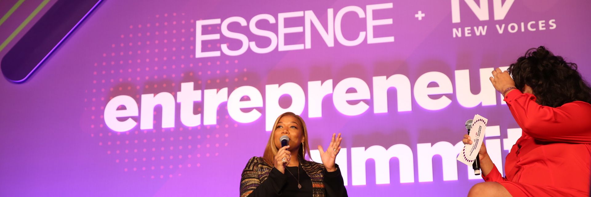 At day two of the ESSENCE + New Voices Entrepreneur Summit in Atlanta, a standing room-only crowd greeted Queen Latifah like royalty. The radiant beauty looked effortless in a multi-colored metallic print duster with a royal flair, paired with a simple black sweater and jeans ripped at the knee, complimented by short, black leather boots. She also sported a gold bottom grill—a rarity for the multi-hyphenate entertainer—who first rose to stardom as a rapper in the male-dominated musical genre.