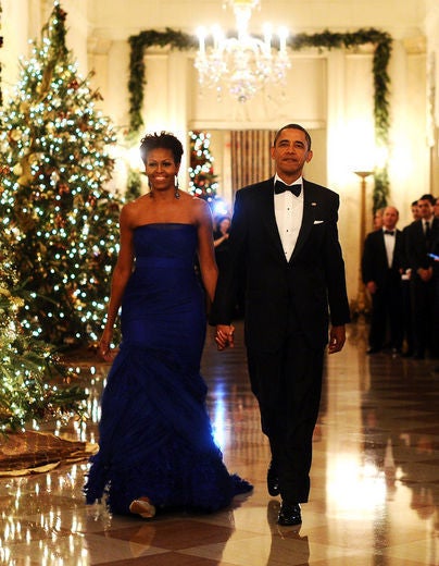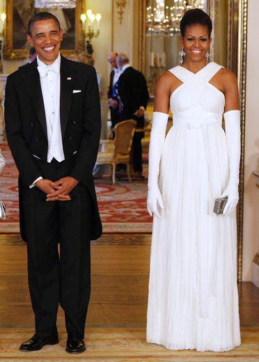 A little peak at Mrs. O’s Monique Lhuillier beaded and chiffon gown and Catherine Angiel earrings is all we need to see to note how fabulous she looked for the occasion.