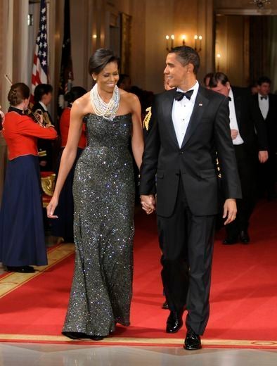 Piled-on pearls and a teal Marchesa gown for the State Dinner makes this look of Michelle O’s most fashionable moments yet.