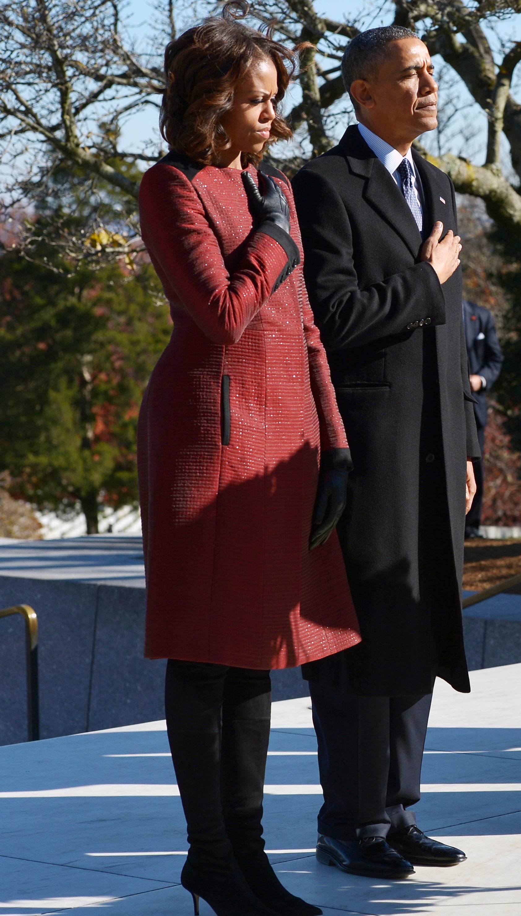 On Veterans day the First Lady’s black double-breasted coat and suede knee-boots was a simple yet stunning move.