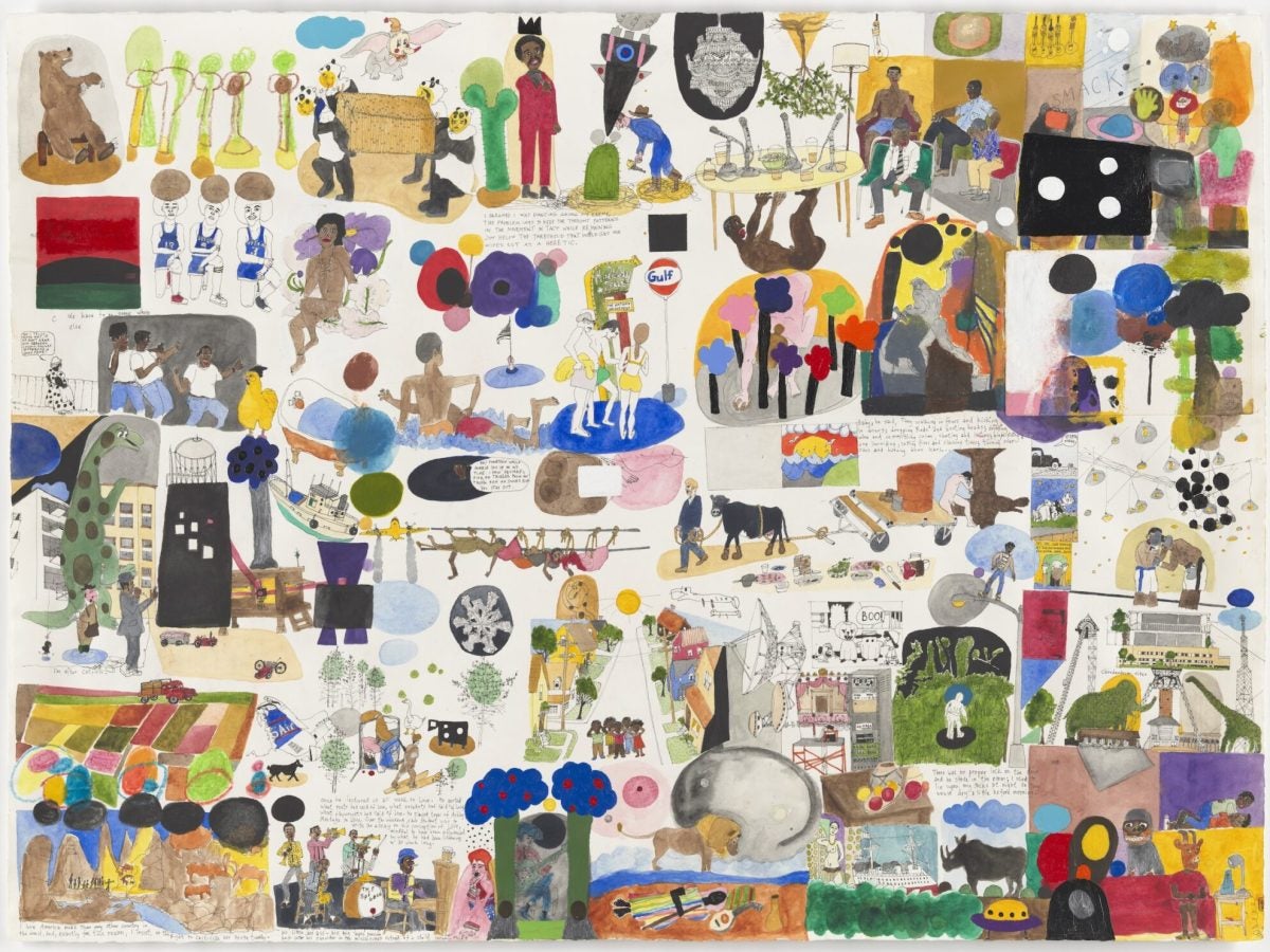 Untitled from the series Untitled (Greatest Black Art History Ever Told);Ralph Lemon;2016 (series: 2015 – 2024, ongoing);sheet: 22 1/4 × 30 1/8″ (56.5 × 76.5 cm);One from a series of twelve drawings in acrylic, ink, gouache, crayon, colored pencil, glitter, and pencil on paper