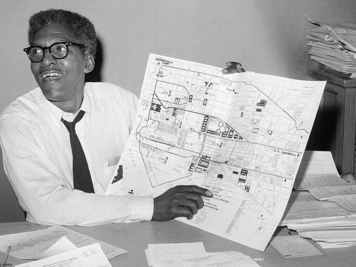 Activist Bayard Rustin points to a map during a press conference four days ahead of the March on Washington in August 1963